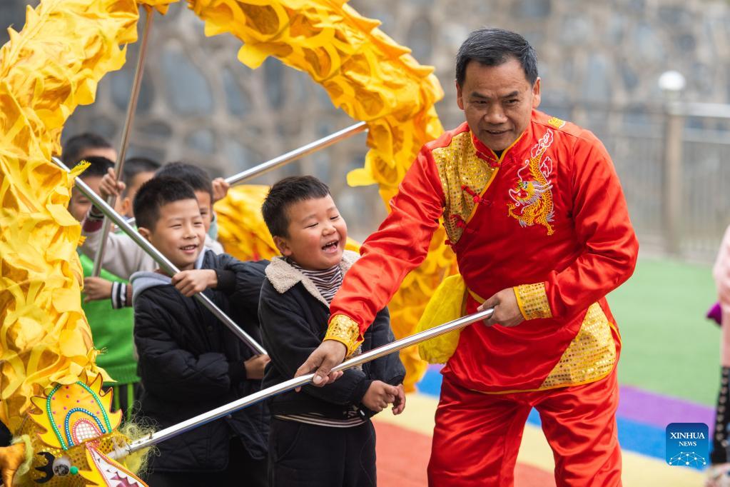 Children learn dragon dance from a folk artist at a kindergarten in Yaotianping Town in Dingcheng District of Changde, central China's Hunan Province, Nov. 17, 2021. The kindergarten invited folk artists to give a dragon dance and lion dance lesson to the children, providing small kids an opportunity to have a close watch on the local intangible cultural heritage. (Xinhua/Chen Sihan)