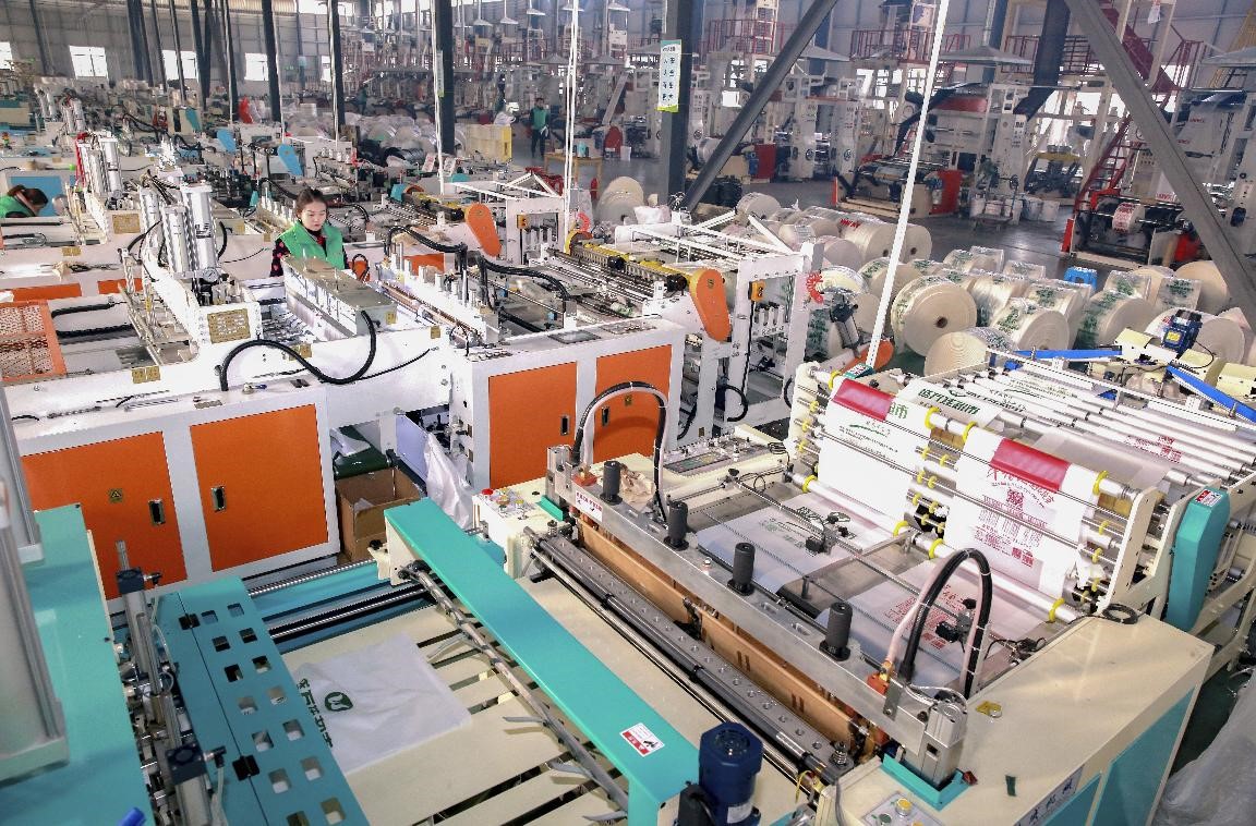 Workers produce biodegradable packaging bags at an industrial park in Tongcheng Economic and Technological Development Zone in east China’s Anhui province, Jan. 7, 2021. (People’s Daily Online/Jiang Sheng)