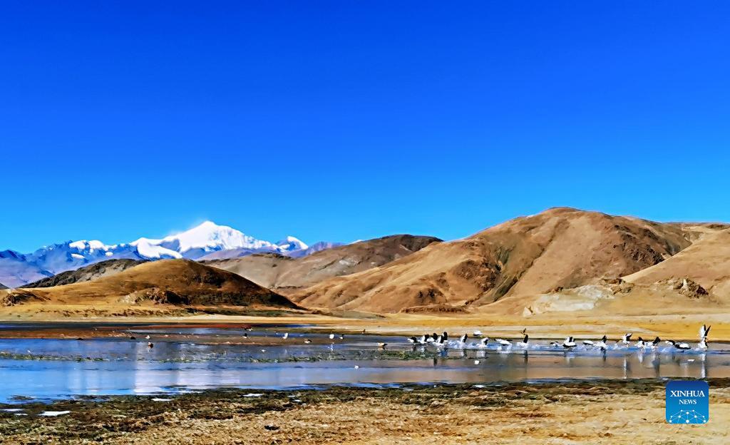 This picture shows the charming view of Yamdrok Lake as winter creeps in. The Yamdrok Lake, which nestles in Nagarze County of Shannan City, southwest China's Tibet Autonomous Region, is one of the three holy lakes in the region. Yamdrok means "jade" in Tibetan, which vividly depicts the limpidity and the fine blue color of the water. (Xinhua/Shen Hongbing)