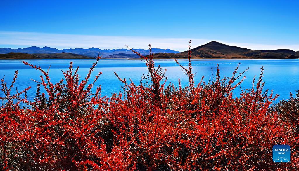 This picture shows the charming view of Yamdrok Lake as winter creeps in. The Yamdrok Lake, which nestles in Nagarze County of Shannan City, southwest China's Tibet Autonomous Region, is one of the three holy lakes in the region. Yamdrok means "jade" in Tibetan, which vividly depicts the limpidity and the fine blue color of the water. (Xinhua/Shen Hongbing)