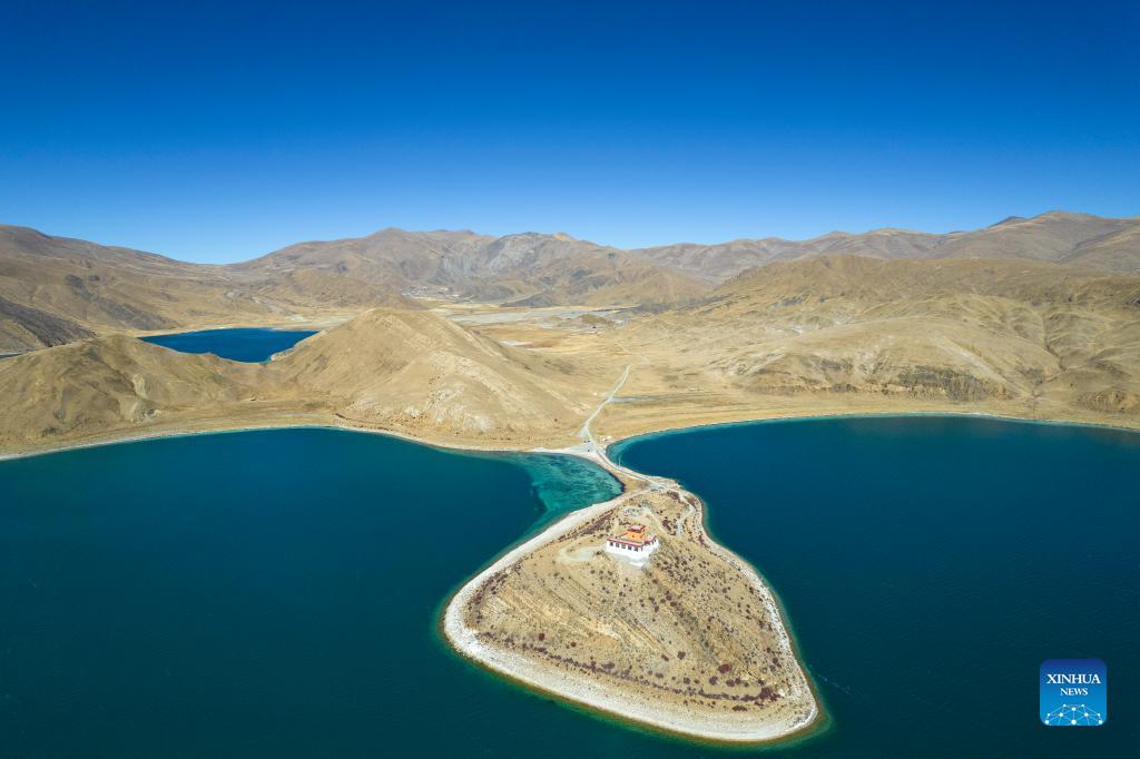 Aerial photo taken on Nov. 16, 2021 shows the scenery of Yamzbog Yumco Lake in Shannan, southwest China's Tibet Autonomous Region. (Xinhua/Sun Ruibo)