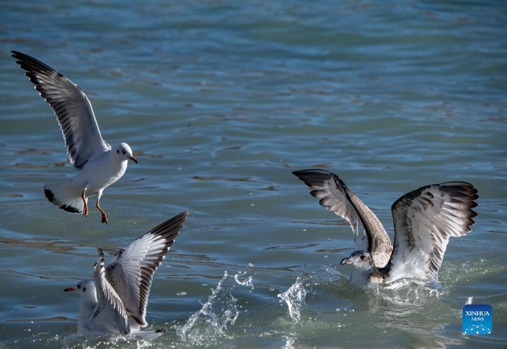Black-headed gulls are seen at Longwangtan park in Lhasa, southwest China's Tibet Autonomous Region, Nov. 17, 2021. (Xinhua/Zhang Rufeng)