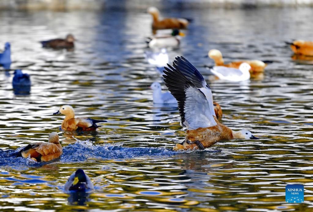 Ruddy shelduck are seen at Longwangtan park in Lhasa, southwest China's Tibet Autonomous Region, Nov. 17, 2021. (Xinhua/Zhang Rufeng)