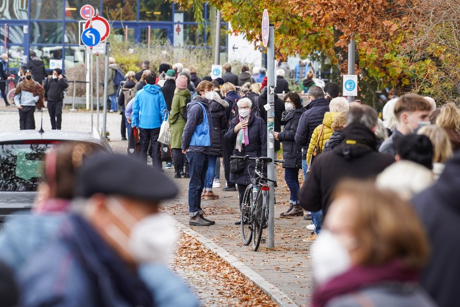 People queue to receive COVID-19 vaccines outside a vaccination center in Berlin, capital of Germany, Nov. 12, 2021. (Xinhua/Stefan Zeitz)