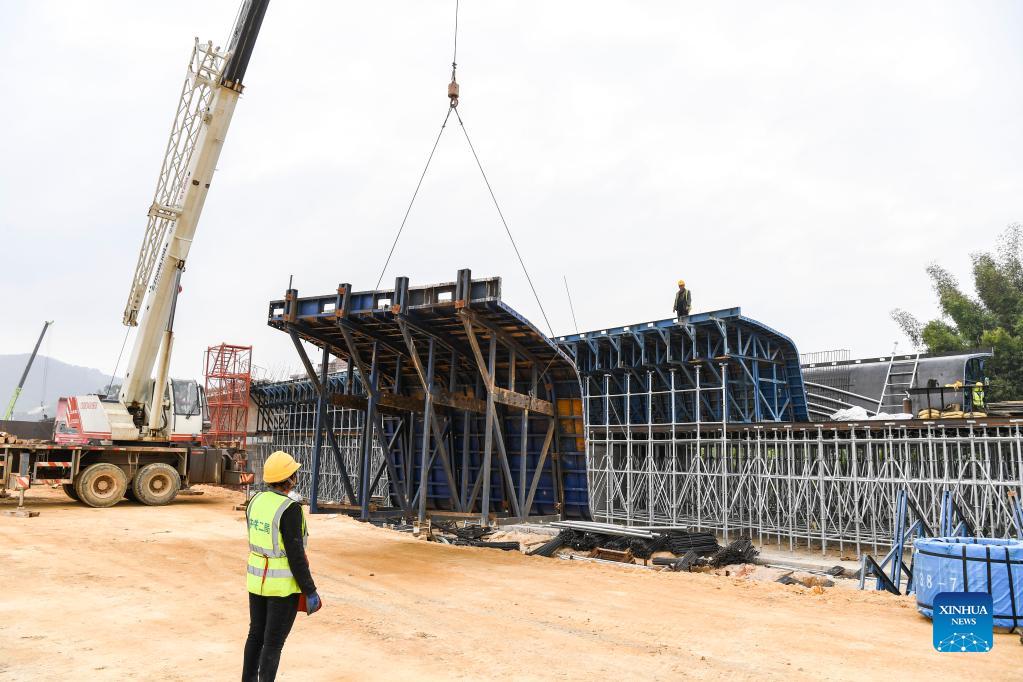 Workers work at the construction site of the high-speed railway linking Nanning and Yulin of south China's Guangxi Zhuang Autonomous Region, Nov. 18, 2021. With a designed speed of 350 km per hour, the Nanning-Yulin high-speed railway is a crucial part of the high-speed railway linking Nanning of Guangxi Zhuang Autonomous Region and Shenzhen of Guangdong Province. (Xinhua/Cao Yiming)