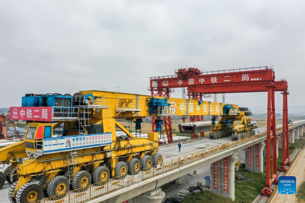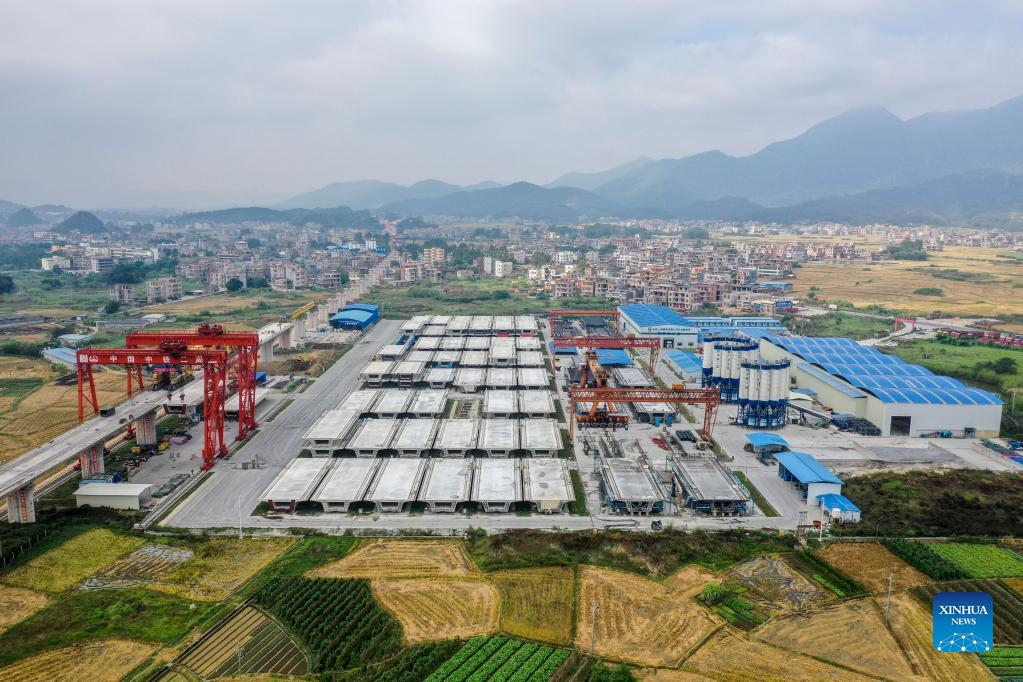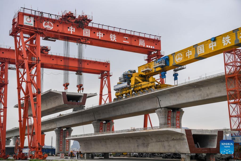 Workers produce a box girder at the construction site of the high-speed railway linking Nanning and Yulin of south China's Guangxi Zhuang Autonomous Region, Nov. 18, 2021. With a designed speed of 350 km per hour, the Nanning-Yulin high-speed railway is a crucial part of the high-speed railway linking Nanning of Guangxi Zhuang Autonomous Region and Shenzhen of Guangdong Province. (Xinhua/Cao Yiming)