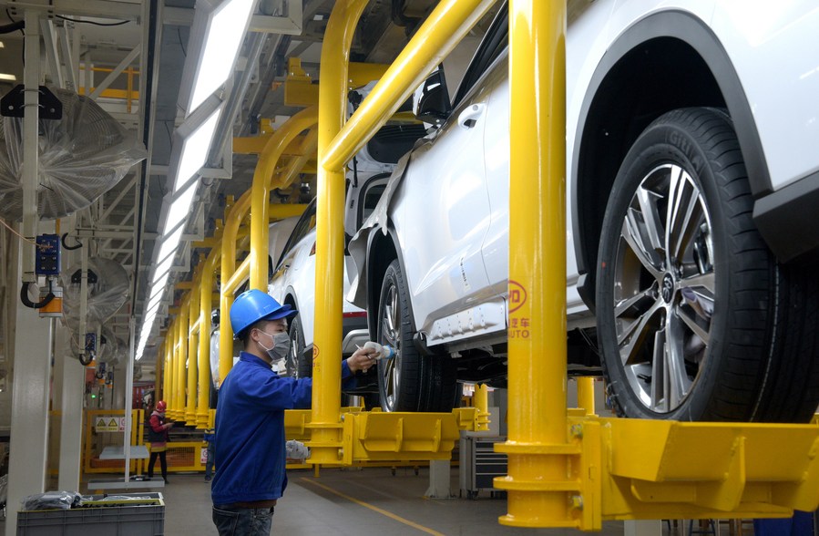 Workers work on the assembly line at a factory of vehicle manufacturer BYD Auto in Xi'an, northwest China's Shaanxi Province, Feb. 25, 2020. (Xinhua/Liu Xiao)