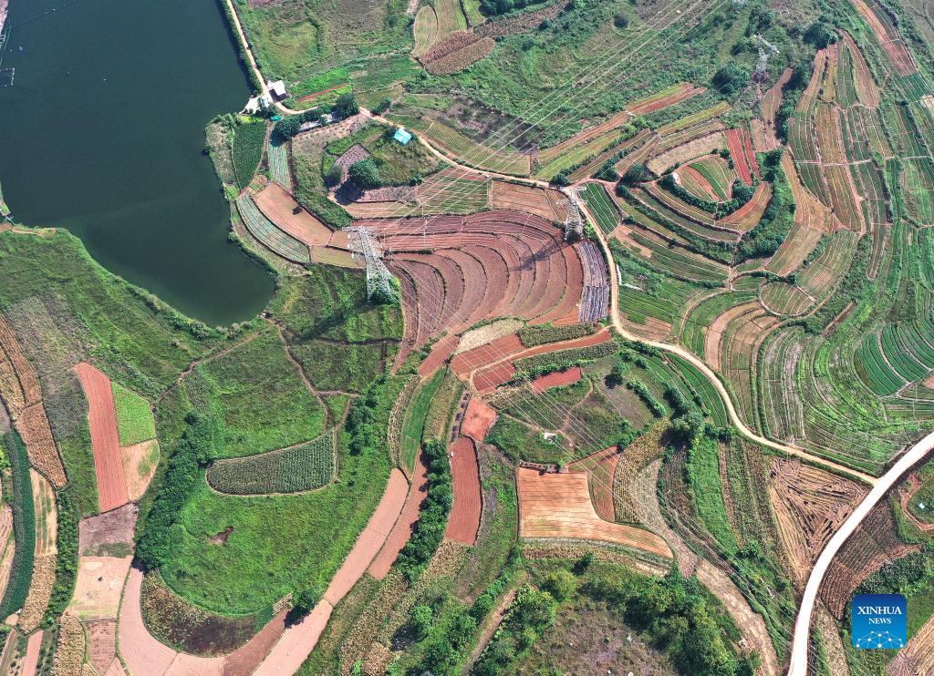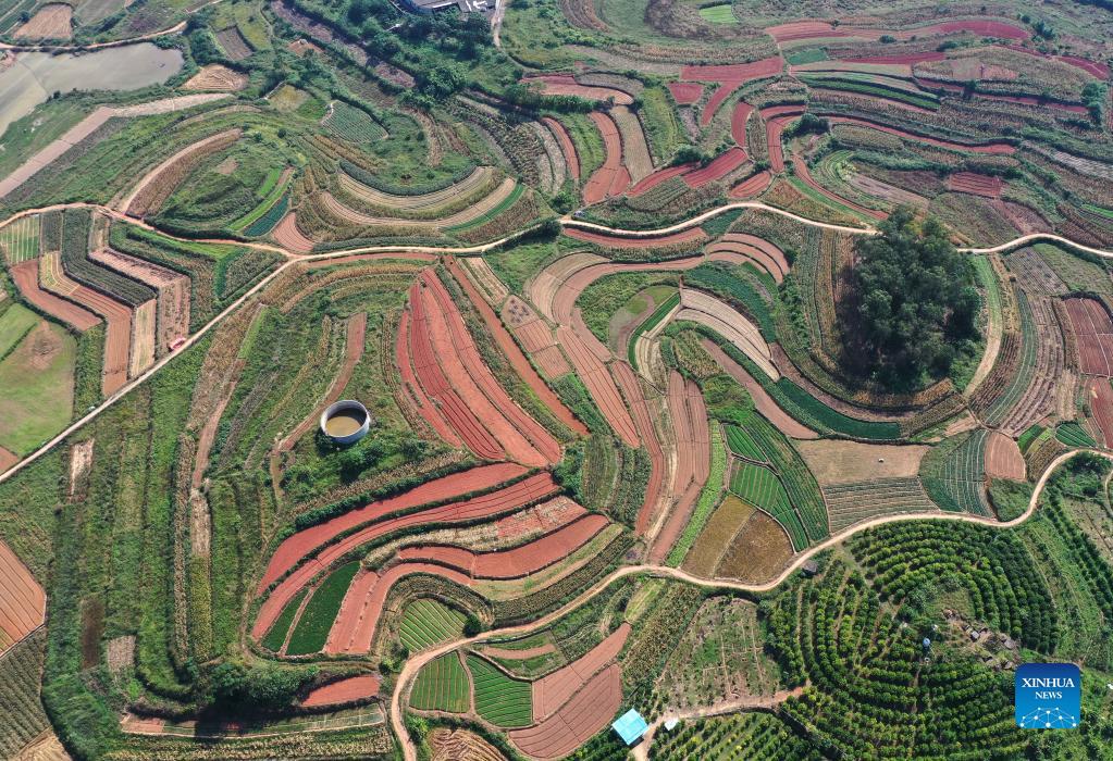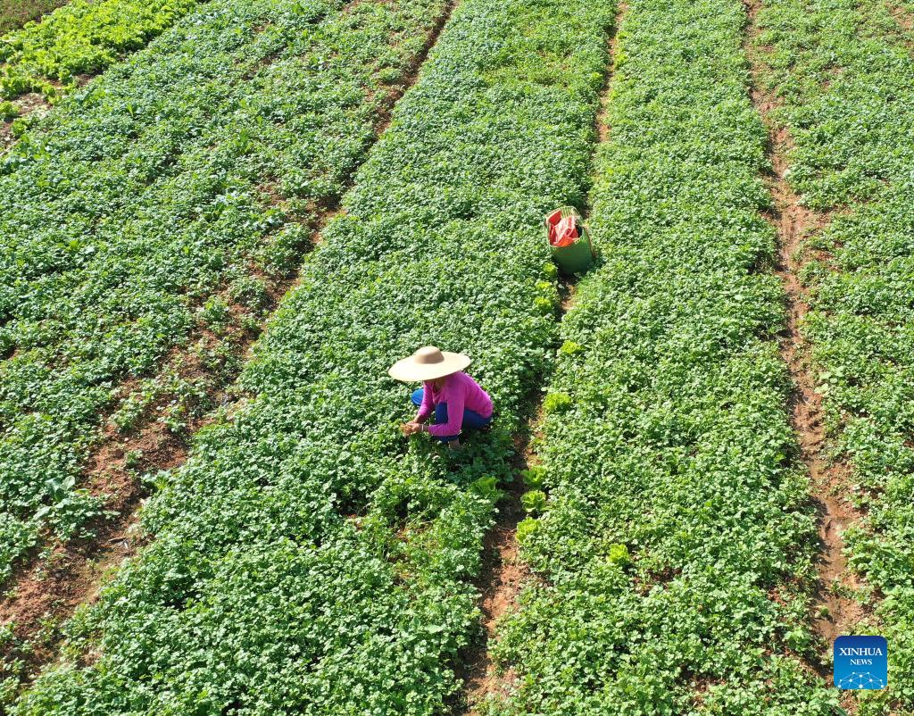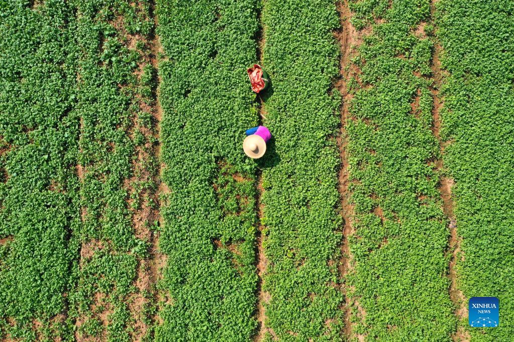 Aerial photo taken on Nov. 18, 2021 shows villagers picking coriander in Pumiao Township, Yongning District, Nanning, south China's Guangxi Zhuang Autonomous Region. (Xinhua/Zhou Hua)