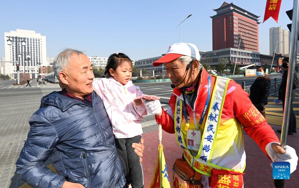 A passerby gives her sweets to octogenarian Ma Jinming as Ma directs traffic voluntarily in Taiyuan, capital of north China's Shanxi Province, Nov. 17, 2021. Ma Jinming, 80, has kept up voluntarily directing traffic on the street for eleven years. (Xinhua/Chai Ting)