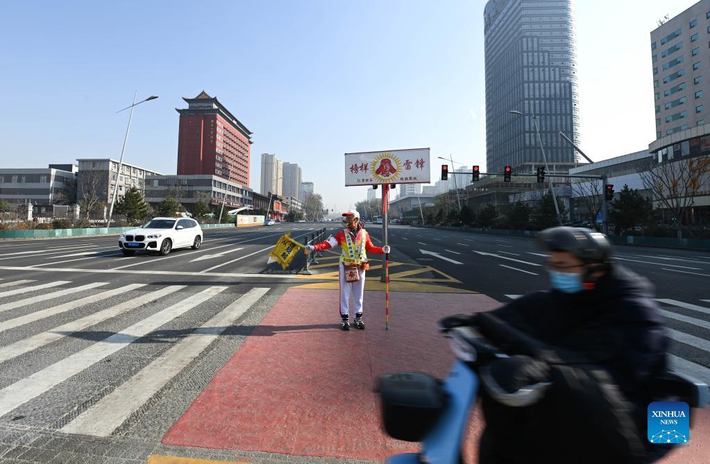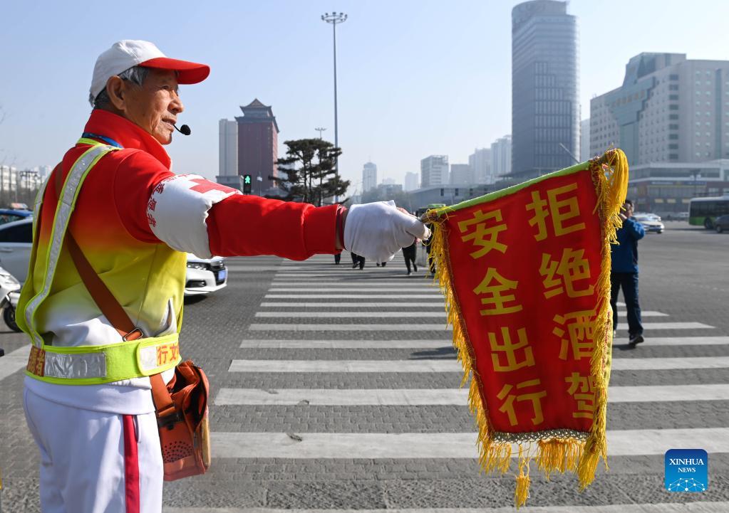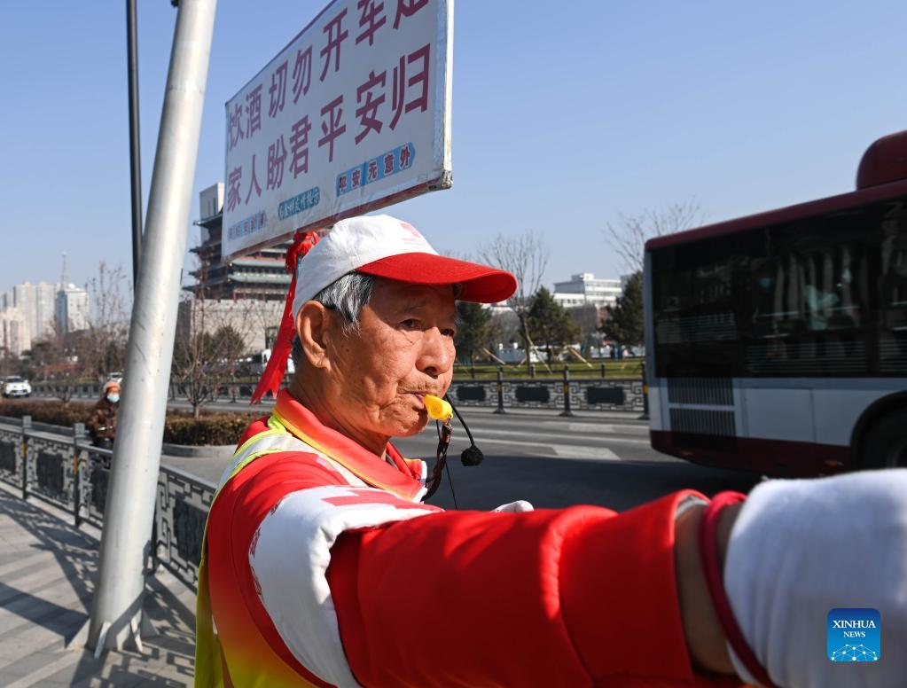 Octogenarian Ma Jinming directs traffic voluntarily in Taiyuan, capital of north China's Shanxi Province, Nov. 17, 2021. Ma Jinming, 80, has kept up voluntarily directing traffic on the street for eleven years. (Xinhua/Chai Ting)