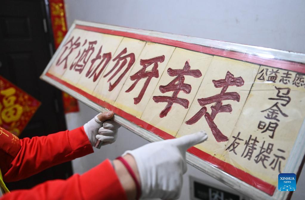Octogenarian Ma Jinming shows the drunken-driving warning sign made by himself in Taiyuan, capital of north China's Shanxi Province, Nov. 17, 2021. Ma Jinming, 80, has kept up voluntarily directing traffic on the street for eleven years. (Xinhua/Chai Ting)