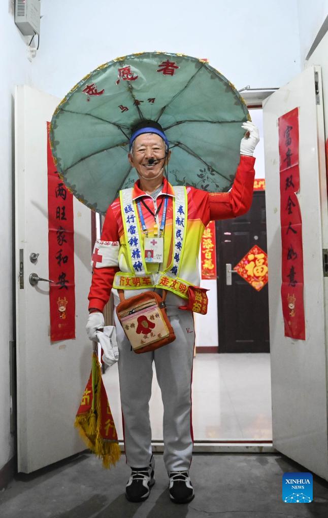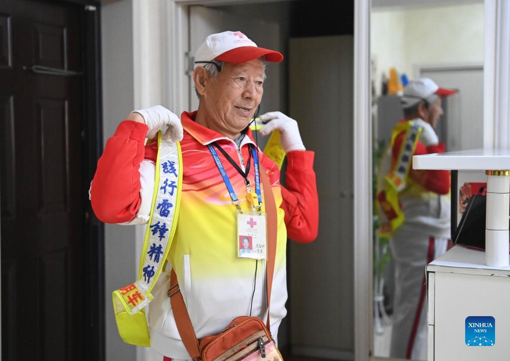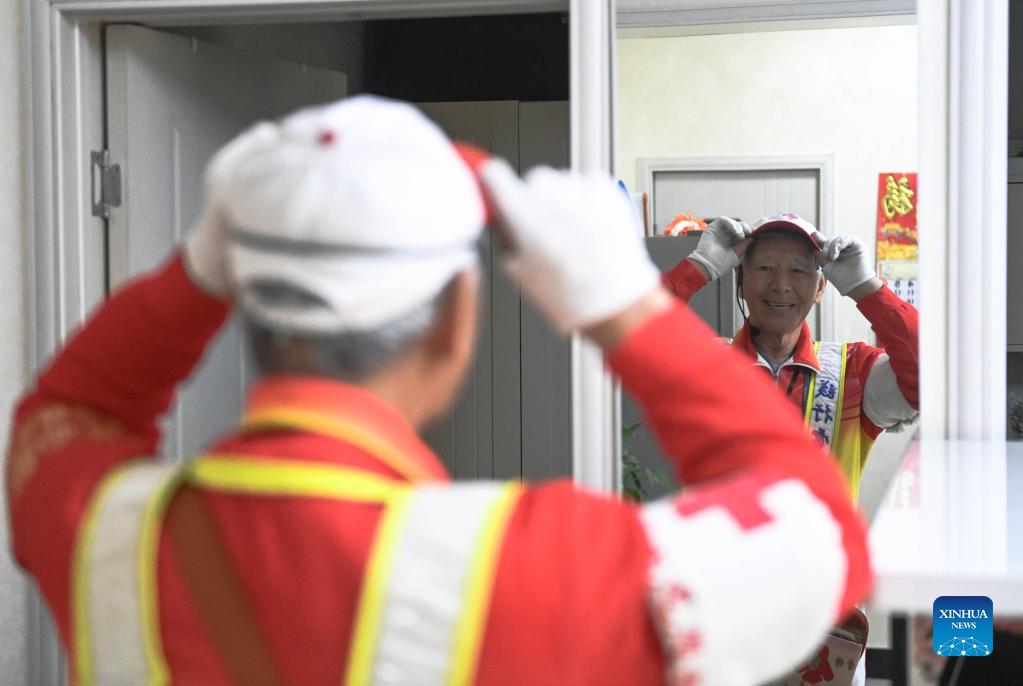 Octogenarian Ma Jinming puts on an uniform prepared by himself as he sets off to direct traffic voluntarily in Taiyuan, capital of north China's Shanxi Province, Nov. 17, 2021. Ma Jinming, 80, has kept up voluntarily directing traffic on the street for eleven years. (Xinhua/Chai Ting)