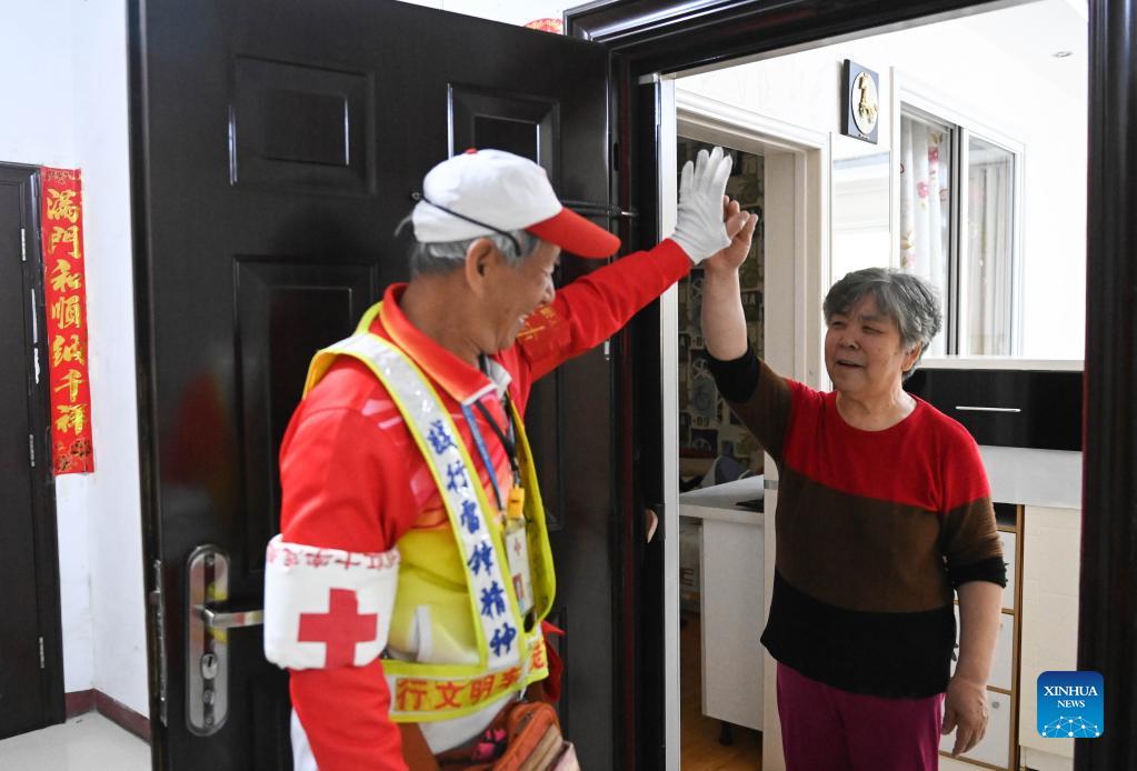 Octogenarian Ma Jinming says goodbye to his wife as he sets off to direct traffic voluntarily in Taiyuan, capital of north China's Shanxi Province, Nov. 17, 2021. Ma Jinming, 80, has kept up voluntarily directing traffic on the street for eleven years. (Xinhua/Chai Ting)