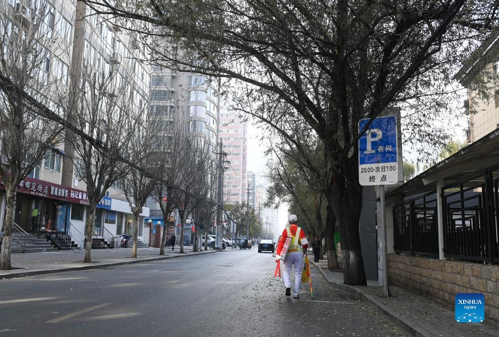 Octogenarian Ma Jinming walks to direct traffic voluntarily in Taiyuan, capital of north China's Shanxi Province, Nov. 17, 2021. Ma Jinming, 80, has kept up voluntarily directing traffic on the street for eleven years. (Xinhua/Chai Ting)