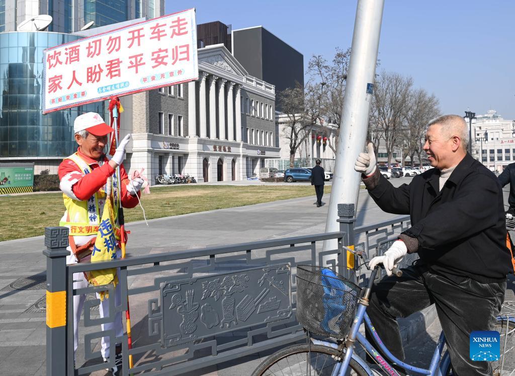 A citizen greets octogenarian Ma Jinming as he directs traffic voluntarily in Taiyuan, capital of north China's Shanxi Province, Nov. 17, 2021. Ma Jinming, 80, has kept up voluntarily directing traffic on the street for eleven years. (Xinhua/Chai Ting)