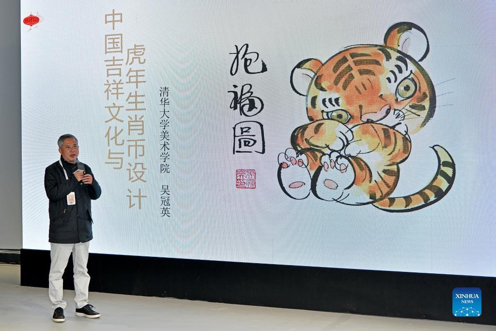 Wu Guanying, one of the designers of the reverse of the commemorative coins to celebrate the Chinese zodiac Year of the Tiger, also professor of Academy of Arts &Design in Tsinghua University, introduces the design of the commemorative coins in Beijing, capital of China, Nov. 18, 2021. China's central bank issued a set of gold and silver commemorative coins on Thursday to celebrate the Chinese zodiac Year of the Tiger. The set consists of eight gold and five silver coins, all of which will be legal tender in China, the People's Bank of China said in an online statement. (Xinhua/Li Xin)