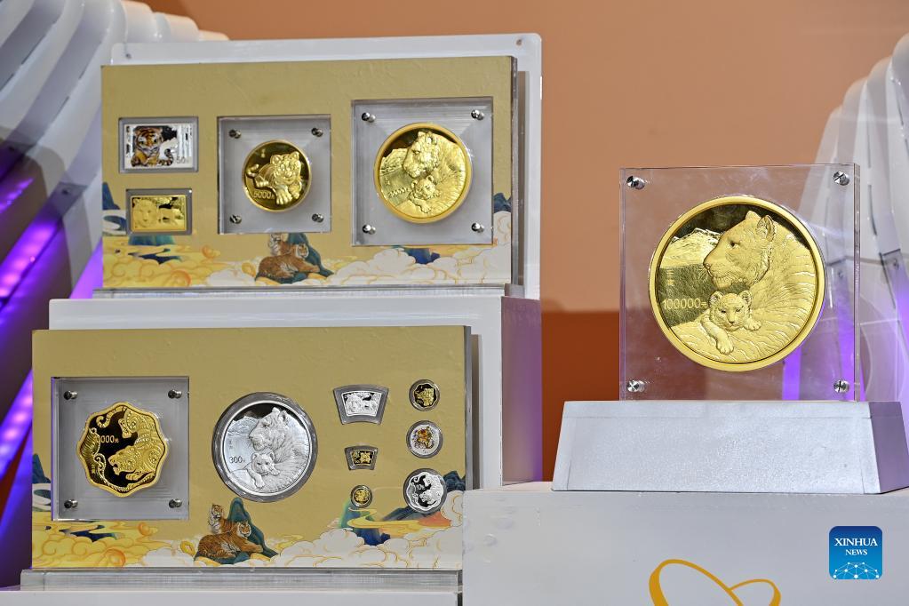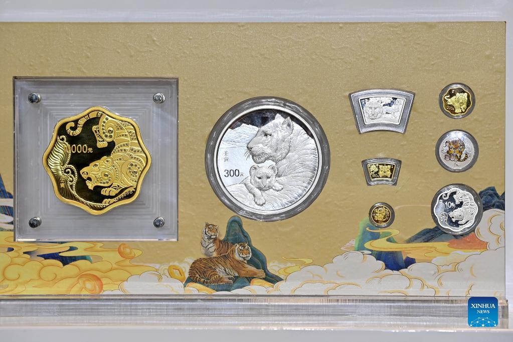The commemorative coins to celebrate the Chinese zodiac Year of the Tiger are pictured in Beijing, capital of China, Nov. 18, 2021. China's central bank issued a set of gold and silver commemorative coins on Thursday to celebrate the Chinese zodiac Year of the Tiger. The set consists of eight gold and five silver coins, all of which will be legal tender in China, the People's Bank of China said in an online statement. (Xinhua/Li Xin)