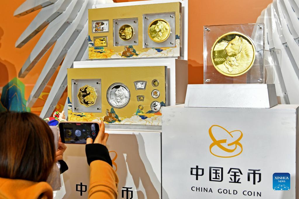 A participant takes a photo of the commemorative coins to celebrate the Chinese zodiac Year of the Tiger at a ceremony in Beijing, capital of China, Nov. 18, 2021. China's central bank issued a set of gold and silver commemorative coins on Thursday to celebrate the Chinese zodiac Year of the Tiger. The set consists of eight gold and five silver coins, all of which will be legal tender in China, the People's Bank of China said in an online statement. (Xinhua/Li Xin)