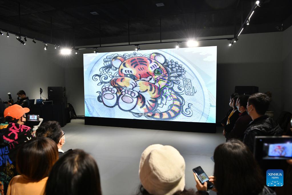 Participants watch a trailer promoting the commemorative coins to celebrate the Chinese zodiac Year of the Tiger at a ceremony in Beijing, capital of China, Nov. 18, 2021. China's central bank issued a set of gold and silver commemorative coins on Thursday to celebrate the Chinese zodiac Year of the Tiger. The set consists of eight gold and five silver coins, all of which will be legal tender in China, the People's Bank of China said in an online statement. (Xinhua/Li Xin)