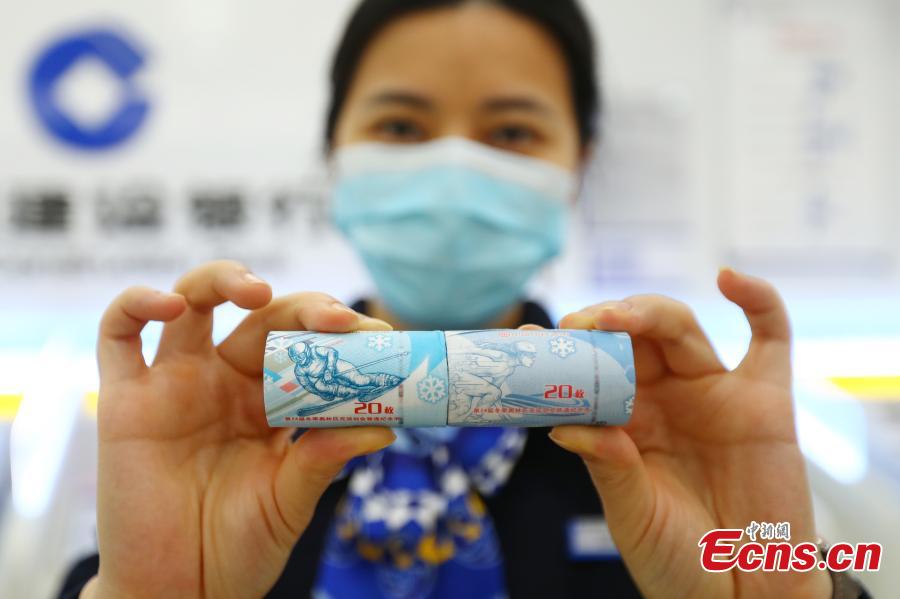 A bank officer shows 40 copper-alloy commemorative coins for the 24th Winter Olympics in Nanchang, East China's Jiangxi province, Nov. 18, 2021. (Photo: China News Service/Liu Zhankun)