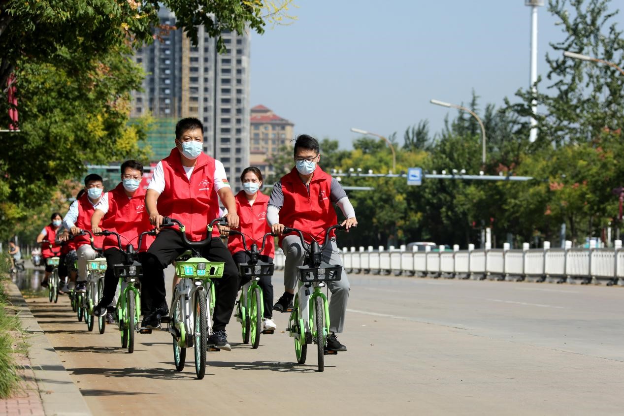 Young volunteers ride shared bikes in an activity held to promote low-carbon lifestyle in Zaozhuang city, east China’s Shandong province, August 25, 2021. (People’s Daily Online/Sun Zhongzhe)