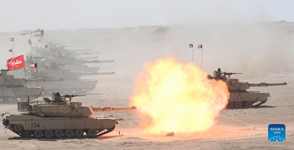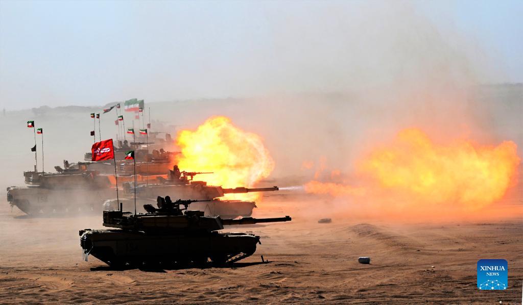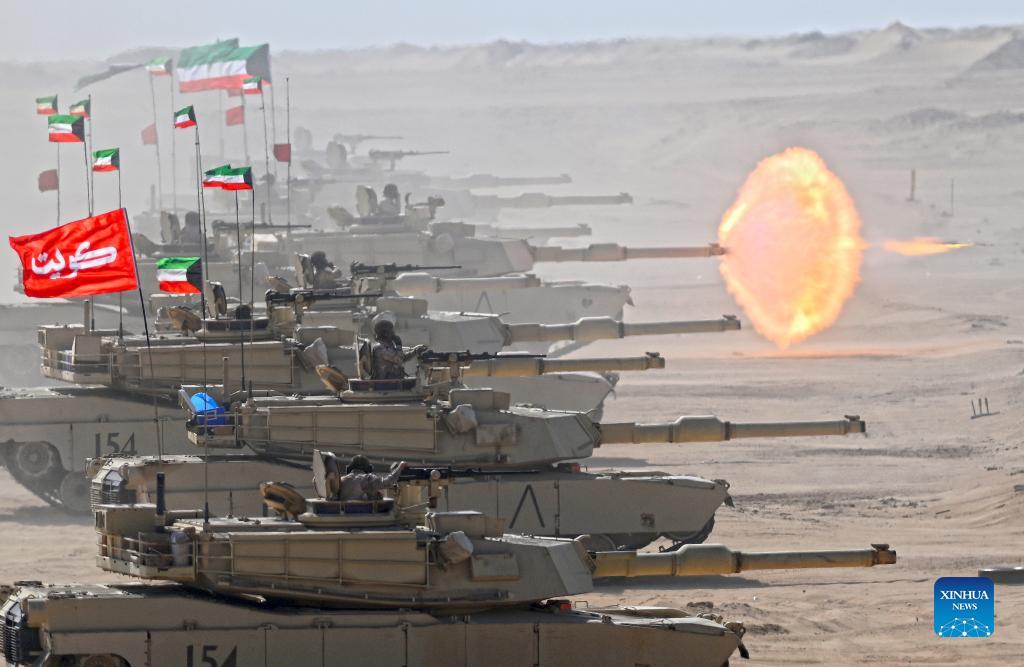 Tanks take part in the "Gulf Shooting 2021" exercise in Jahra Governorate, Kuwait, on Nov. 18, 2021. Kuwait concluded on Thursday the "Gulf Shooting 2021" exercise with the participation of Saudi and U.S. forces, said Sheikh Thamer Al-Ali Al-Sabah, Kuwaiti Interior Minister and Acting Defense Minister. (Photo by Asad/Xinhua)