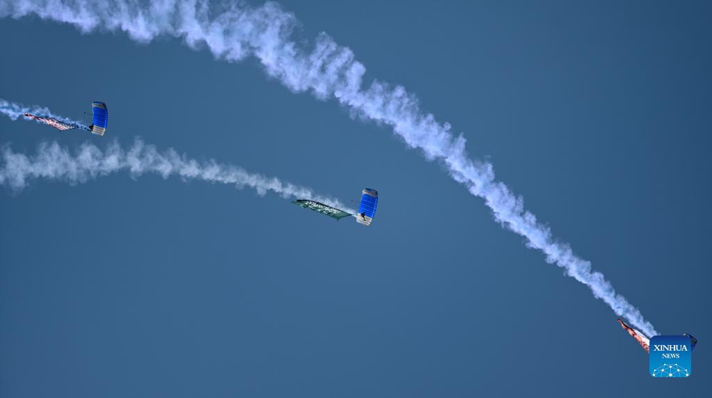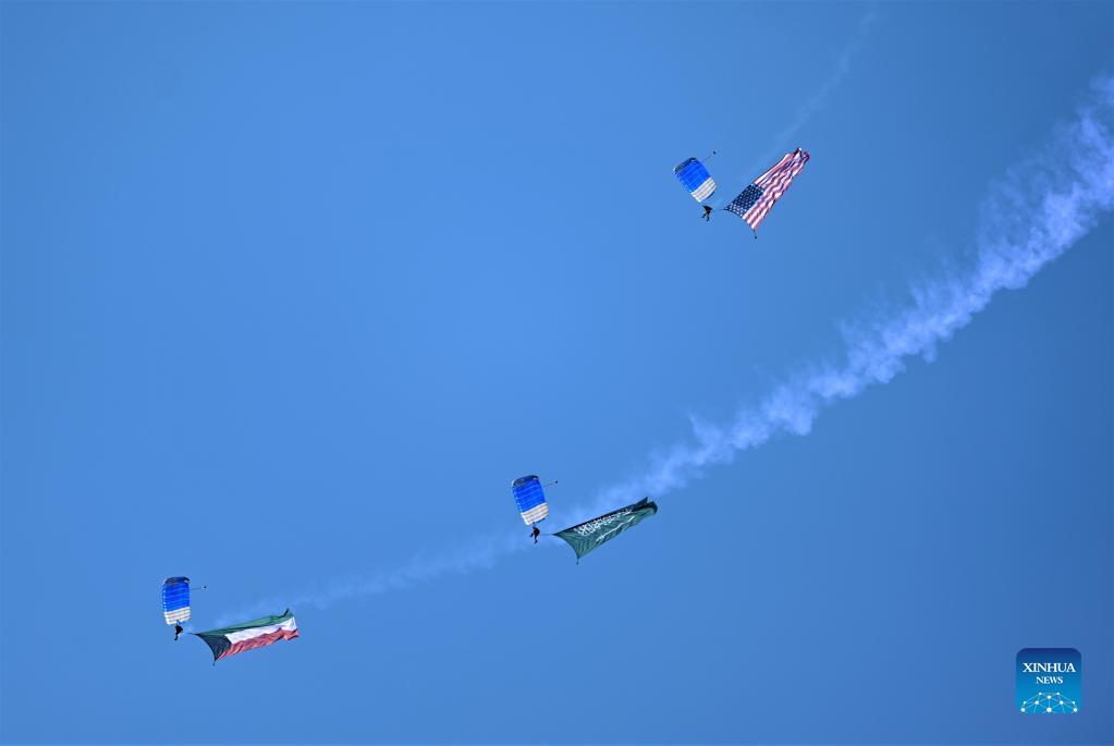 Paratroopers carrying flags of Kuwait, Saudi Arabia and the United States take part in the "Gulf Shooting 2021" exercise in Jahra Governorate, Kuwait, on Nov. 18, 2021. Kuwait concluded on Thursday the "Gulf Shooting 2021" exercise with the participation of Saudi and U.S. forces, said Sheikh Thamer Al-Ali Al-Sabah, Kuwaiti Interior Minister and Acting Defense Minister. (Photo by Asad/Xinhua)