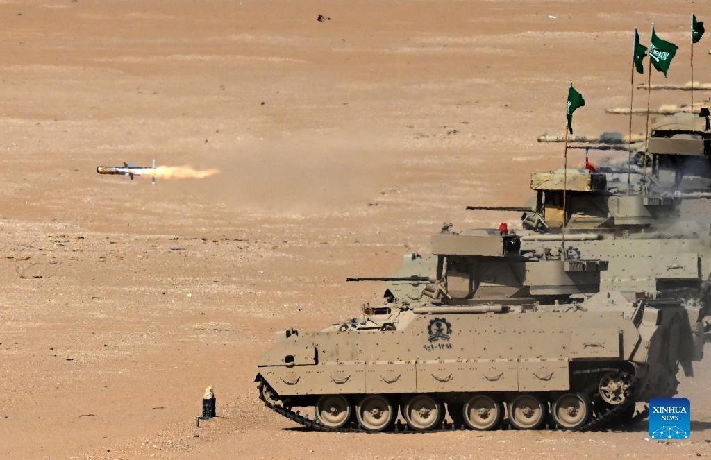 Armored vehicles take part in the "Gulf Shooting 2021" exercise in Jahra Governorate, Kuwait, on Nov. 18, 2021. Kuwait concluded on Thursday the "Gulf Shooting 2021" exercise with the participation of Saudi and U.S. forces, said Sheikh Thamer Al-Ali Al-Sabah, Kuwaiti Interior Minister and Acting Defense Minister. (Photo by Asad/Xinhua)