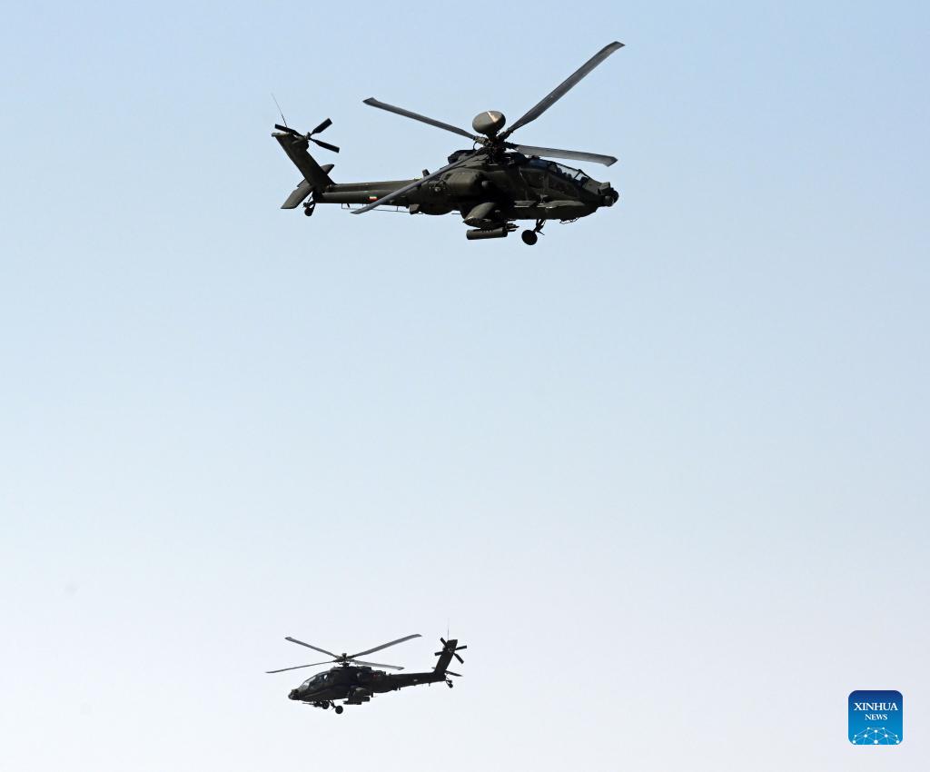 Helicopters take part in the "Gulf Shooting 2021" exercise in Jahra Governorate, Kuwait, on Nov. 18, 2021. Kuwait concluded on Thursday the "Gulf Shooting 2021" exercise with the participation of Saudi and U.S. forces, said Sheikh Thamer Al-Ali Al-Sabah, Kuwaiti Interior Minister and Acting Defense Minister. (Photo by Asad/Xinhua)