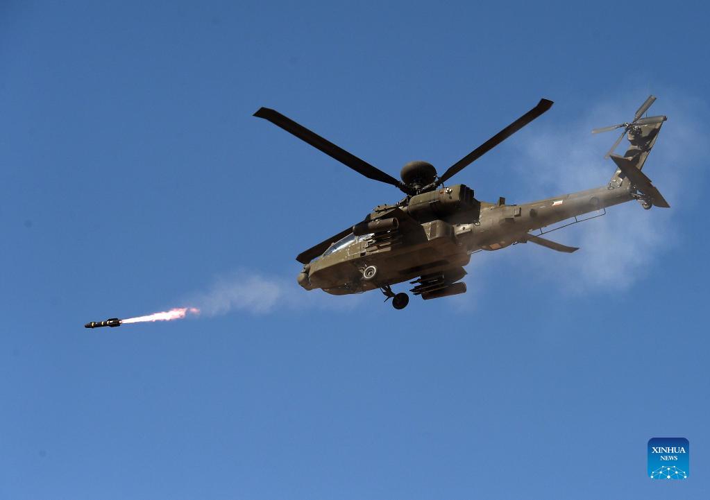 A helicopter launches a guided missile during the "Gulf Shooting 2021" exercise in Jahra Governorate, Kuwait, on Nov. 18, 2021. Kuwait concluded on Thursday the "Gulf Shooting 2021" exercise with the participation of Saudi and U.S. forces, said Sheikh Thamer Al-Ali Al-Sabah, Kuwaiti Interior Minister and Acting Defense Minister. (Photo by Asad/Xinhua)