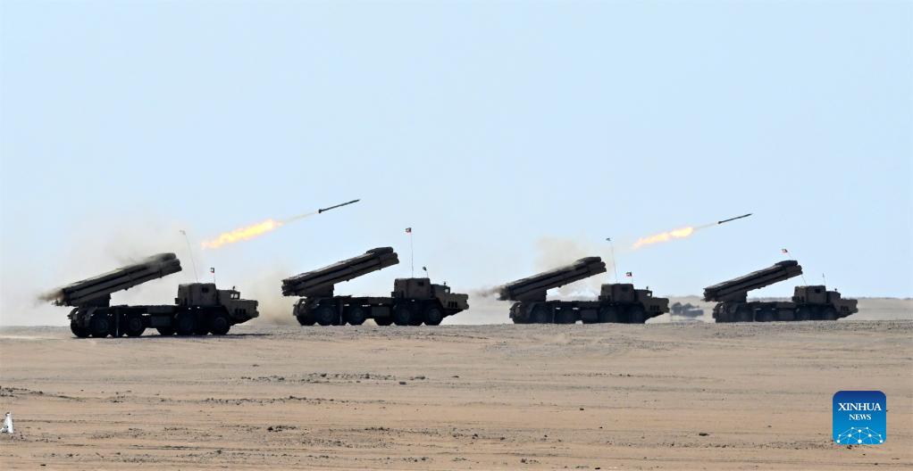 Rocket launchers fire as they take part in the "Gulf Shooting 2021" exercise in Jahra Governorate, Kuwait, on Nov. 18, 2021. Kuwait concluded on Thursday the "Gulf Shooting 2021" exercise with the participation of Saudi and U.S. forces, said Sheikh Thamer Al-Ali Al-Sabah, Kuwaiti Interior Minister and Acting Defense Minister. (Photo by Asad/Xinhua)