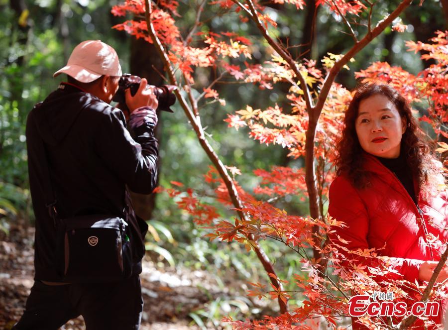 Red maple leaves create a picturesque scenery in early winter, attracting scores of visitors in Kunming, Southwest China's Yunnan Province, Nov. 18, 2021. (Photo: China News Service/Wang Jiaxian)