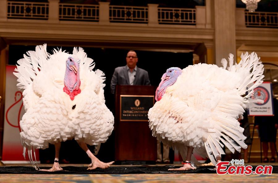 Two turkeys named Peanut Butter and Jelly are presented in Washington, D.C., the United States, Nov. 18, 2021. They will be pardoned by the U.S. President for the 2021 Thanksgiving Day. (Photo: China News Service/Chen Mengtong)
