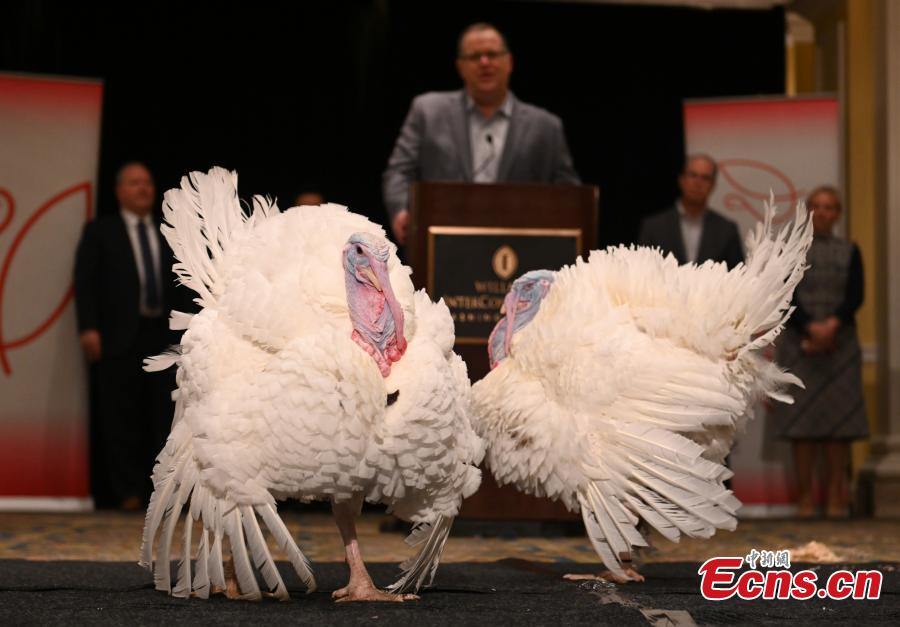 Two turkeys named Peanut Butter and Jelly are presented in Washington, D.C., the United States, Nov. 18, 2021. They will be pardoned by the U.S. President for the 2021 Thanksgiving Day. (Photo: China News Service/Chen Mengtong)