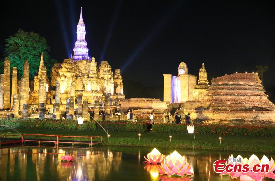 Lights shine at the Sukhothai Historical Park in Thailand, Nov. 18, 2021. (Photo: China News Service/Wang Guoan)
