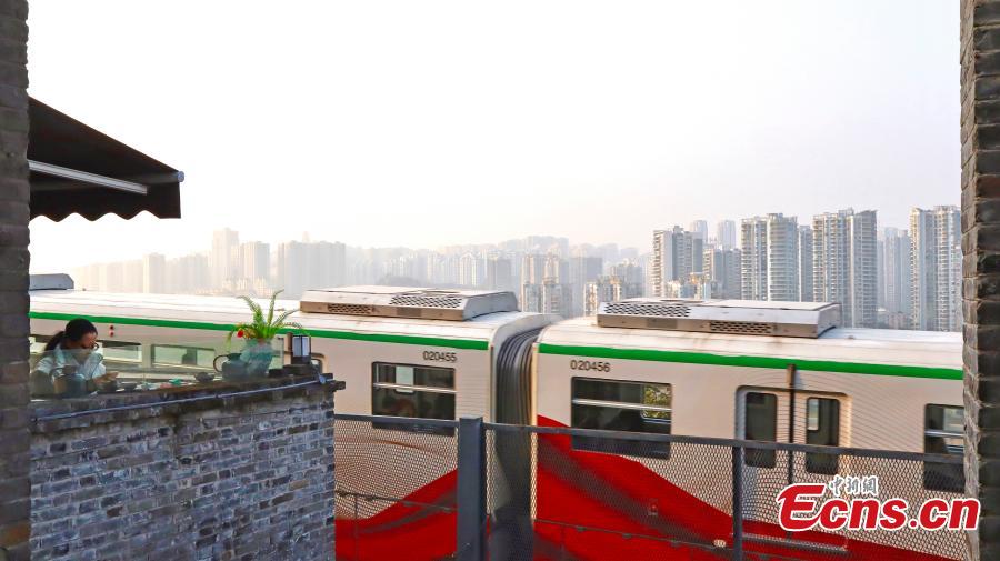 A century-old building on the "three-story road" of Liziba has been transformed into a teahouse, attracting many visitors due to its proximity to the light rail line, Yuzhong District, Southwest China's Chongqing Municipality. (Photo: China News Service/Ouyang Yunjing)