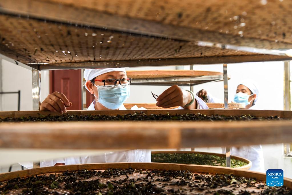 Tea farmers sort tea leaves at a tea processing plant in Pengtang Village of Shanxin Town in Xingye County, south China's Guangxi Zhuang Autonomous Region, Nov. 19, 2021. During the past years, Xingye has made great efforts to promote characteristic industries based on local conditions such as introducing advanced farming and cultivating techniques and better types of agricultural products, so as to boost farmers' income. (Xinhua/Cao Yiming)