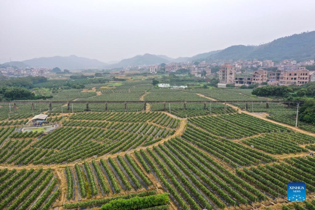 Aerial photo taken on Nov. 19, 2021 shows a dragon fruit planting base in Dapingshan Town of Xingye County, south China's Guangxi Zhuang Autonomous Region. During the past years, Xingye has made great efforts to promote characteristic industries based on local conditions such as introducing advanced farming and cultivating techniques and better types of agricultural products, so as to boost farmers' income. (Xinhua/Cao Yiming)