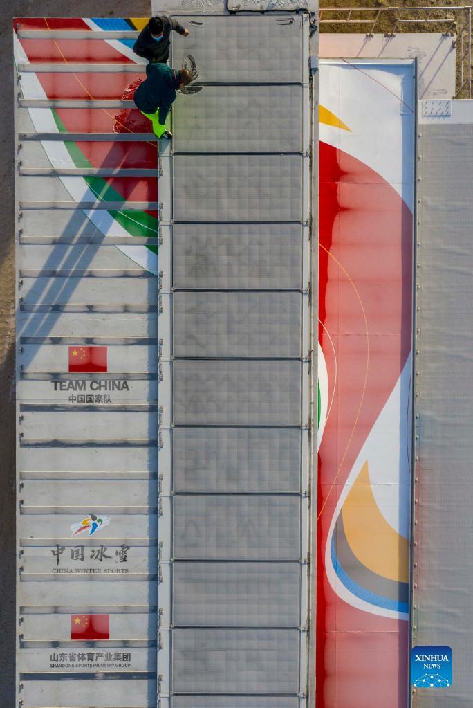Photo taken with a UAV drone shows maintenance crew working on the rooftop of the new waxing truck in Wenquan County, northwest China's Xinjiang Uygur Autonomous Region, Nov. 17, 2021. China's very first self-developed waxing truck was deployed during the Chinese national cross-country skiing team training session for the 2022 Olympic Winter Games. It comes with 6 waxing benches, cabins for storaging and other uses. (Xinhua/Hu Huhu)