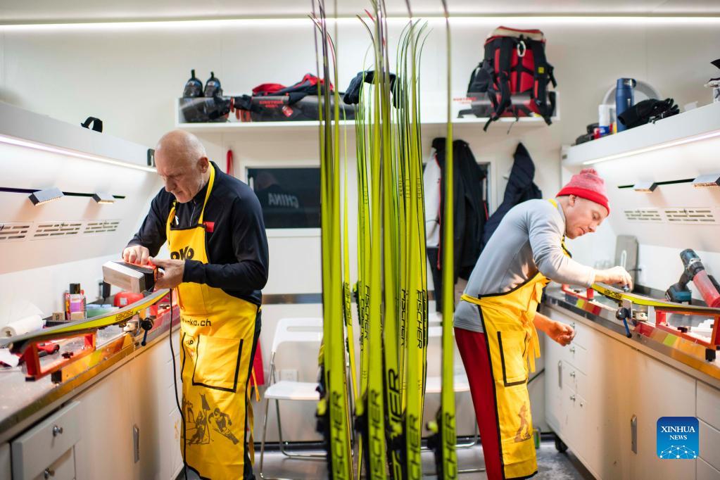Waxing technicians work in the new waxing truck in Wenquan County, northwest China's Xinjiang Uygur Autonomous Region, Nov. 16, 2021. China's very first self-developed waxing truck was deployed during the Chinese national cross-country skiing team training session for the 2022 Olympic Winter Games. It comes with 6 waxing benches, cabins for storaging and other uses. (Xinhua/Hu Huhu)
