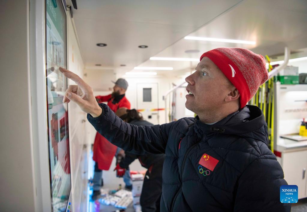 Waxing technician Bernhard Ronning operates a pannel in the new waxing truck in Wenquan County, northwest China's Xinjiang Uygur Autonomous Region, Nov. 16, 2021. China's very first self-developed waxing truck was deployed during the Chinese national cross-country skiing team training session for the 2022 Olympic Winter Games. It comes with 6 waxing benches, cabins for storaging and other uses. (Xinhua/Hu Huhu)