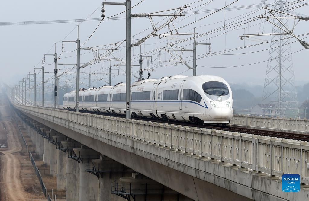 A train runs in the Anqing-Huangmei section of the Anqing-Jiujiang high-speed railway in Anqing, east China's Anhui Province, Nov. 19, 2021. The trial operation of the Anqing-Huangmei section of the Anqing-Jiujiang high-speed railway began on Friday. (Xinhua/Zhou Mu)