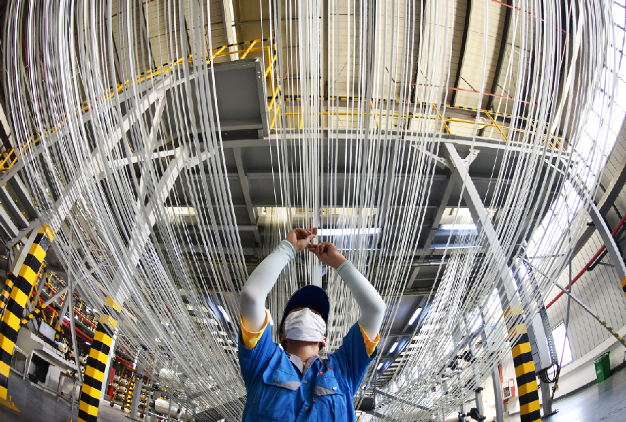 A worker checks the operation of a carbon fiber production line at a factory in Lianyungang, Jiangsu province. (Photo by Geng Yuhe/for China Daily)