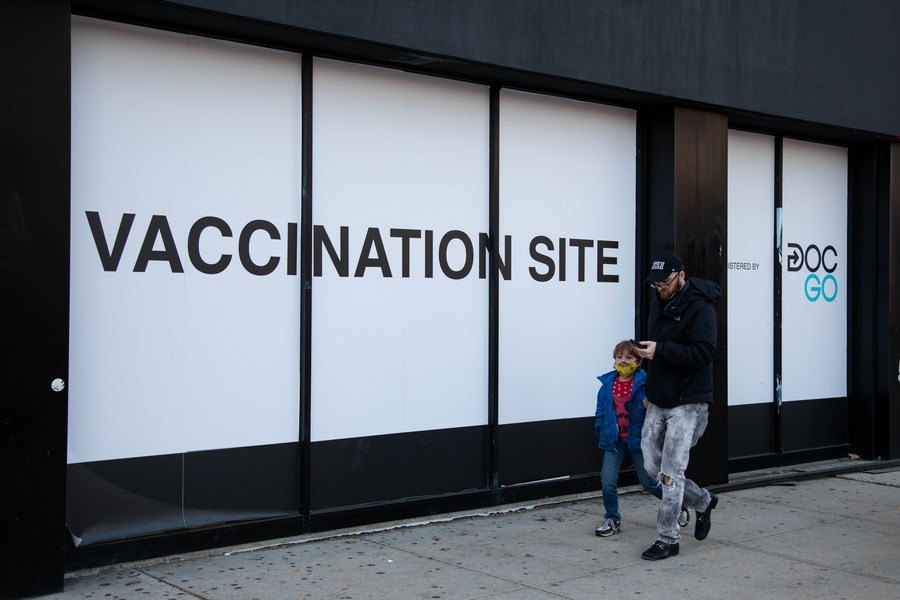Pedestrians walk in front of a COVID-19 vaccination site in the Brooklyn borough of New York, the United States, Nov. 19, 2021. (Photo by Michael Nagle/Xinhua)