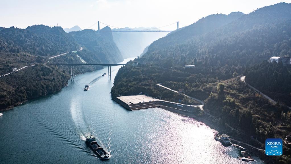 Aerial photo taken on Nov. 18, 2021 shows cargo ships loaded with phosphate ore sailing on the Wujiang River in Sinan County, southwest China's Guizhou Province. The Wujiang River waterway in Guizhou, which had been cut off for nearly 20 years due to the construction of hydropower stations along the river, has fully resumed to traffic recently. (Xinhua/Tao Liang)