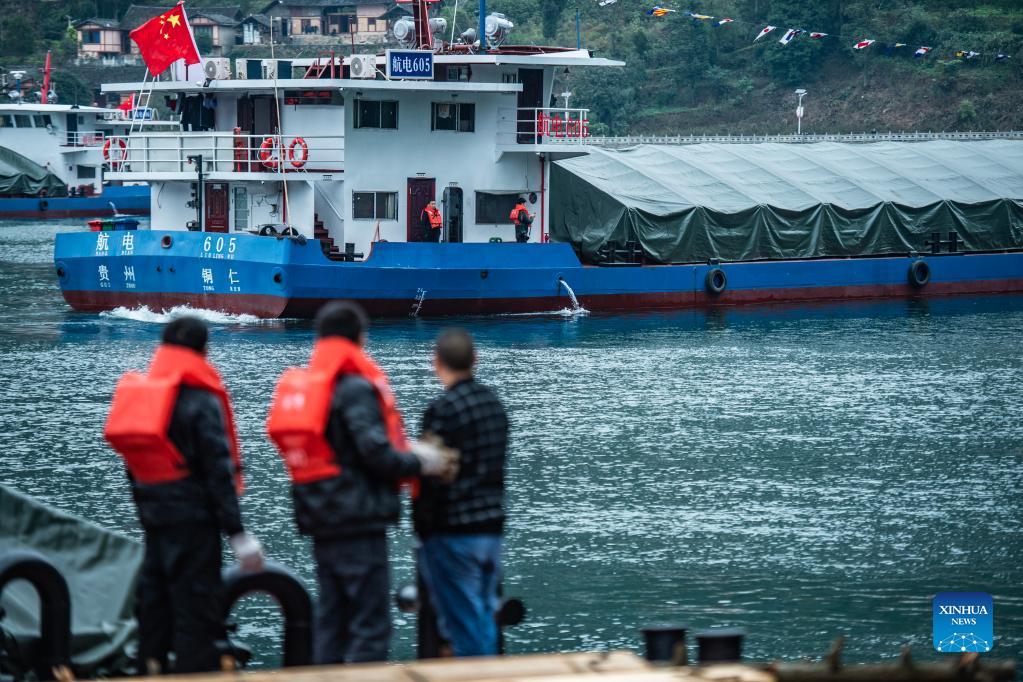 Villagers watch a cargo ship loaded with phosphate ore leaving a pier in Guiyang, southwest China's Guizhou Province, Nov. 16, 2021. The Wujiang River waterway in Guizhou, which had been cut off for nearly 20 years due to the construction of hydropower stations along the river, has fully resumed to traffic recently. (Xinhua/Tao Liang)