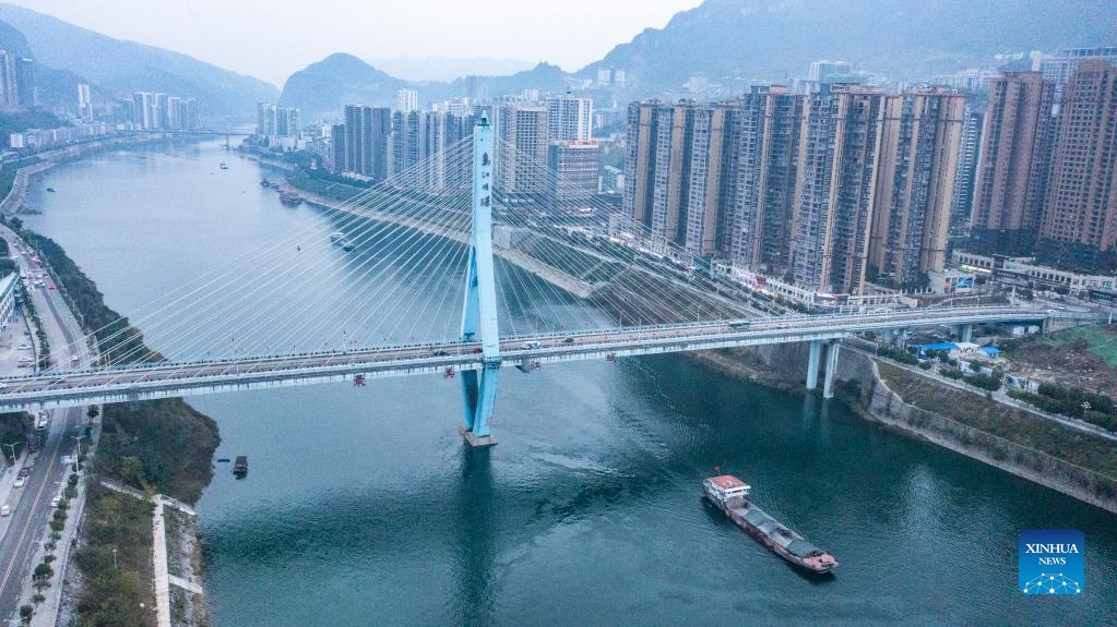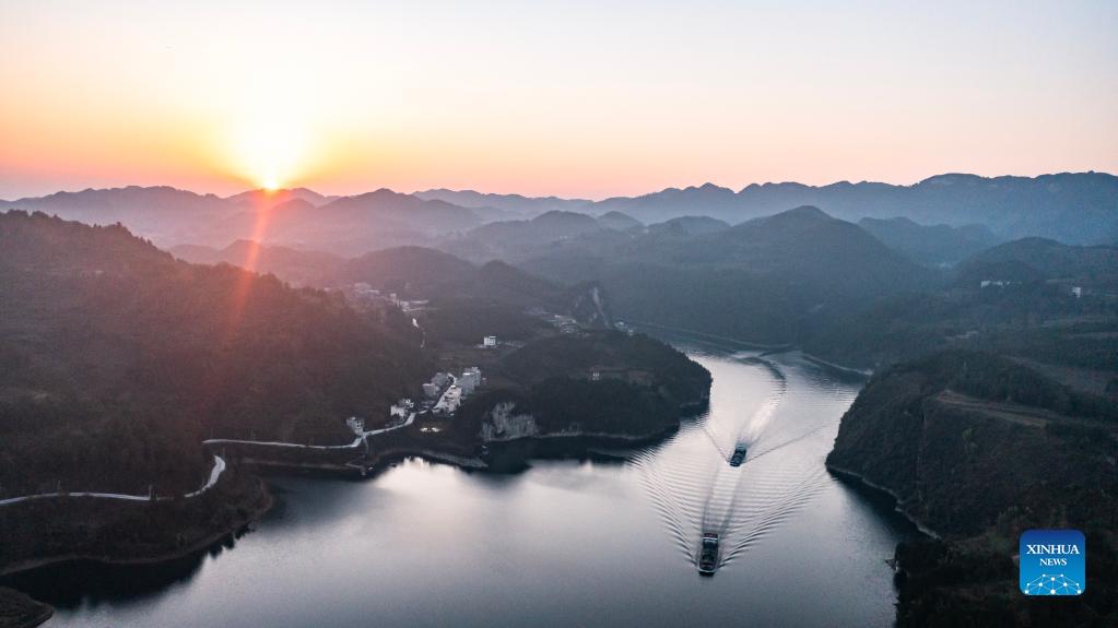 Aerial photo taken on Nov. 19, 2021 shows a cargo ship loaded with phosphate ore sailing on the Wujiang River in Sinan County, southwest China's Guizhou Province. The Wujiang River waterway in Guizhou, which had been cut off for nearly 20 years due to the construction of hydropower stations along the river, has fully resumed to traffic recently. (Xinhua/Tao Liang)