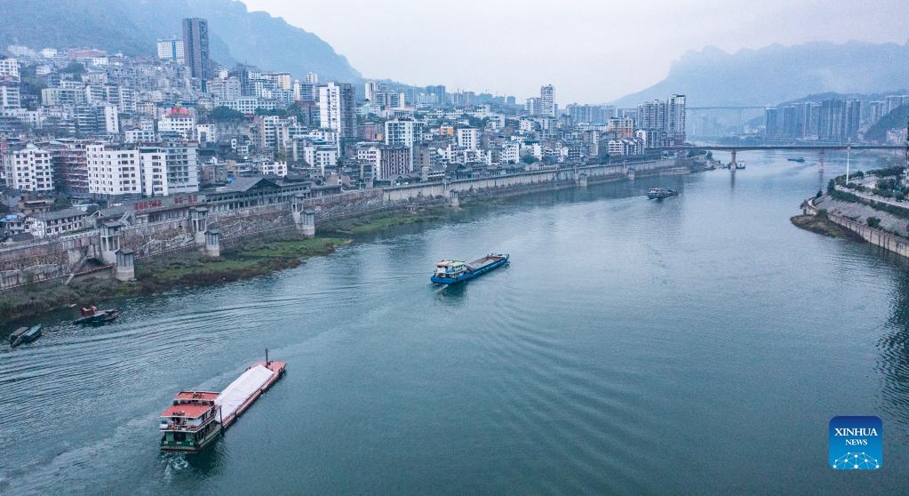 Aerial photo taken on Nov. 19, 2021 shows cargo ships loaded with phosphate ore sailing on the Wujiang River in Sinan County, southwest China's Guizhou Province. The Wujiang River waterway in Guizhou, which had been cut off for nearly 20 years due to the construction of hydropower stations along the river, has fully resumed to traffic recently. (Xinhua/Tao Liang)