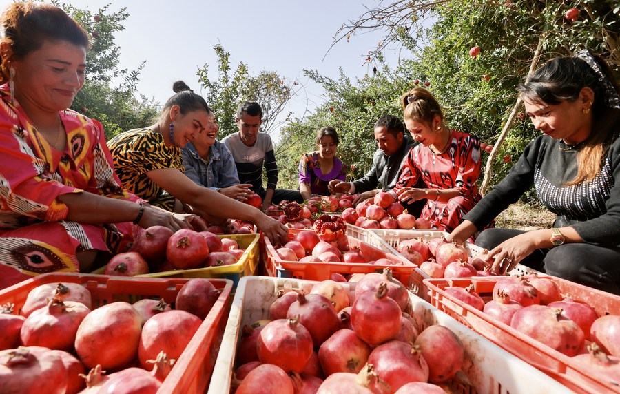 Villagers pick pomegranates in Qira Town of Qira County in Hotan Prefecture, northwest China's Xinjiang Uygur Autonomous Region, Oct. 1, 2021. (Photo by Xu Xiaolong/Xinhua)