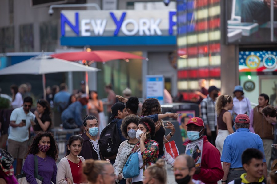 People walk through Times Square in New York, the United States, Oct. 2, 2021. (Photo by Michael Nagle/Xinhua)